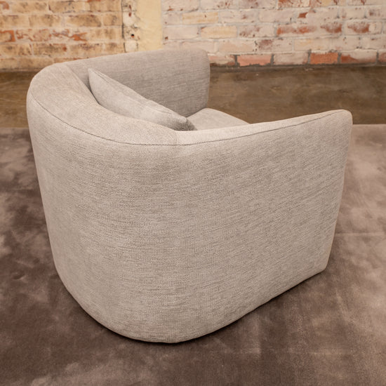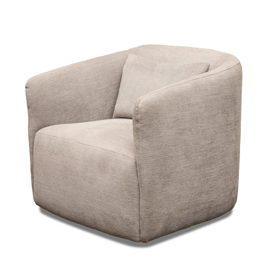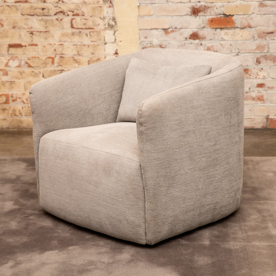 Contemporary swivel chair. Back infused with NZ wool. Layered foam seat. Feather lumbar.