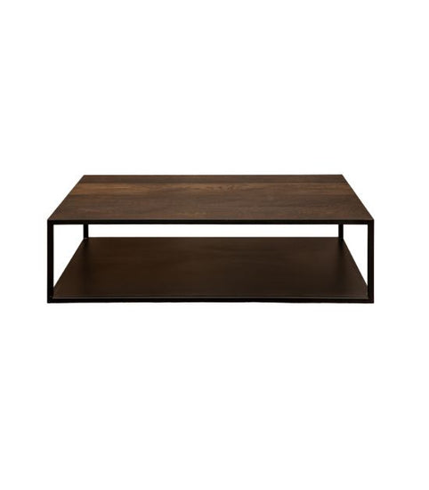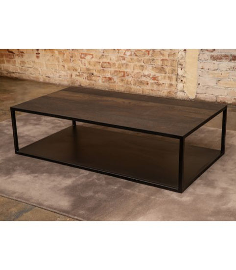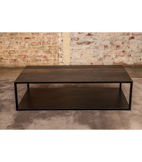Oblong coffee table with inset planked Oak top and steel base with shelf.