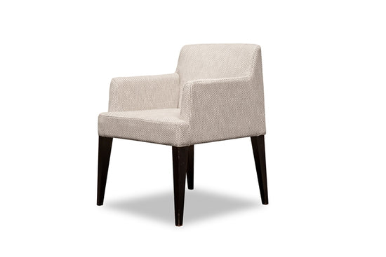 Upholstered low back dining chair with arms. Bordered back and seat. No-sag sprung seat. Stained wooden legs.
