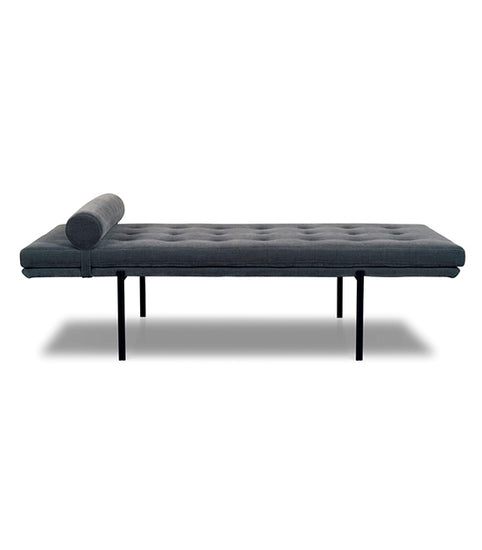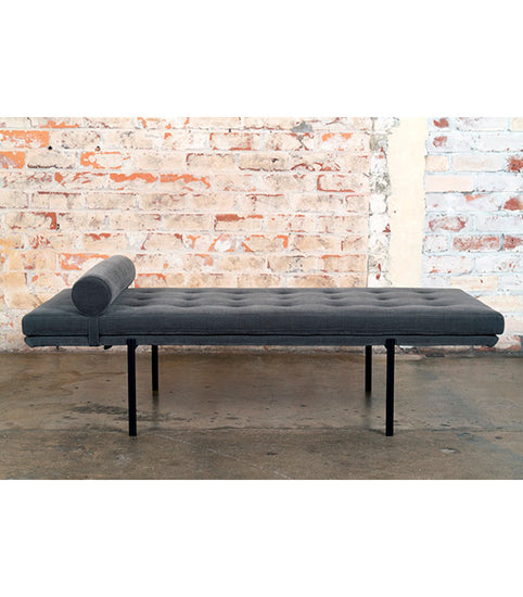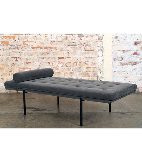 Tufted cushion on fine upholstered base with matt black steel legs.