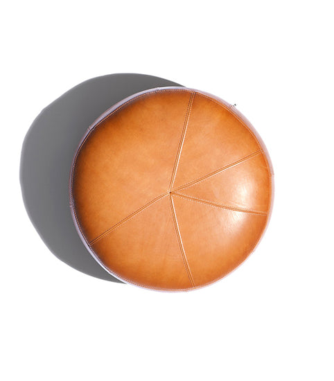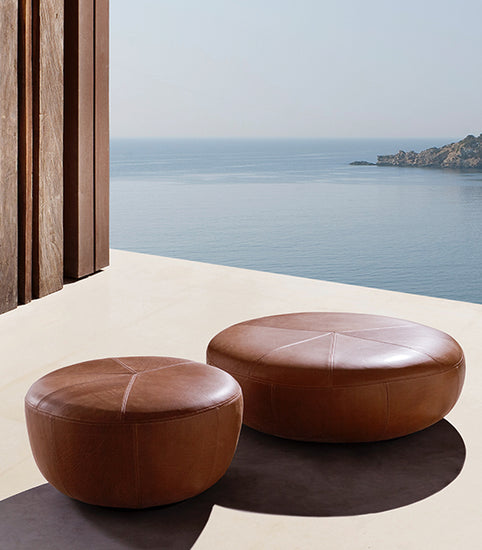 Leather pouf for indoor or outdoor. Foam structure with breathable polyethylene coated lining. Neoprene feet.
