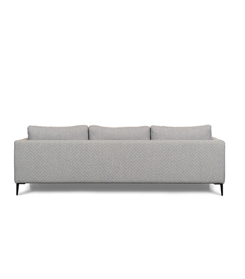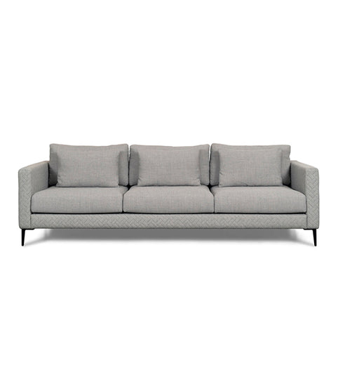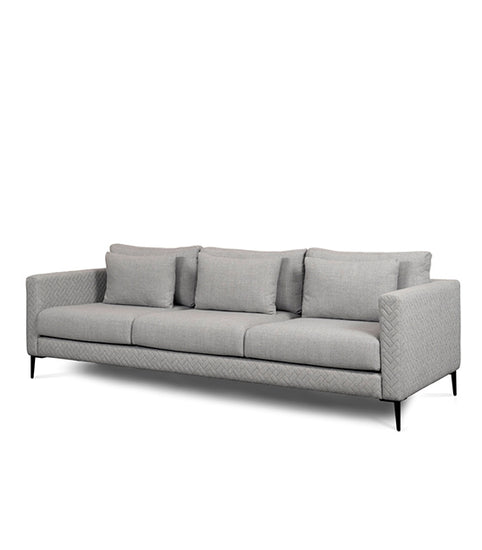 A fine tailored sofa with soft & structured cushioning. Feather & fibre back cushions. Feather & down lumber cushions. Non-reversible Super Lux seat cushions. Metal legs in matt black.