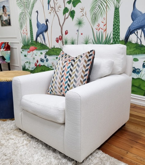 Luxurious comfortable arm chair. Two tier back cushions including feather and down lumbar cushion. Luxura foam seat cushion. Dressmakers skirt.