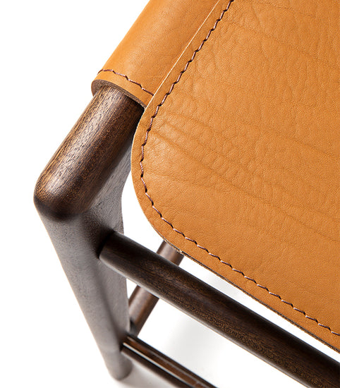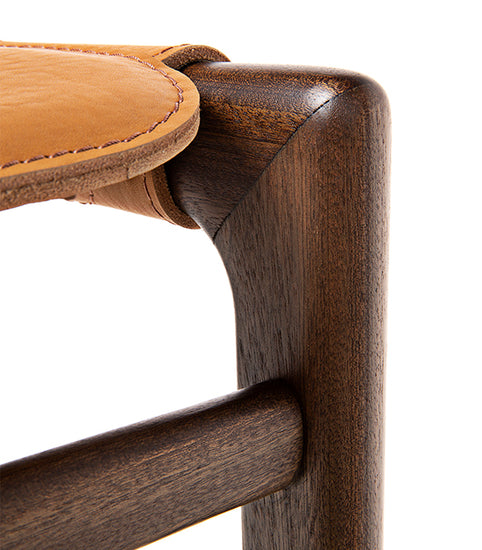 Barstool with mahogany frame and saddle leather back and seat. Stainless steel hardware.
