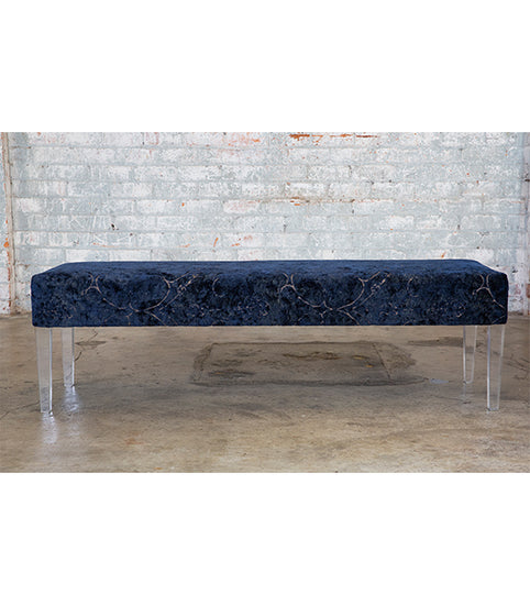 Upholstered bench seat with Lucite legs.