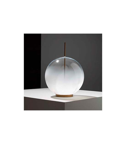 Table lamp with diffused light. Natural burnished brass structure with hand blown glass diffuser.