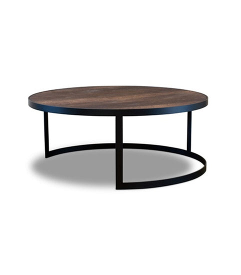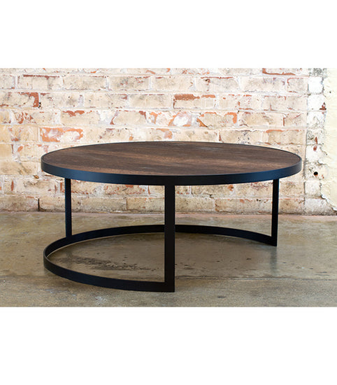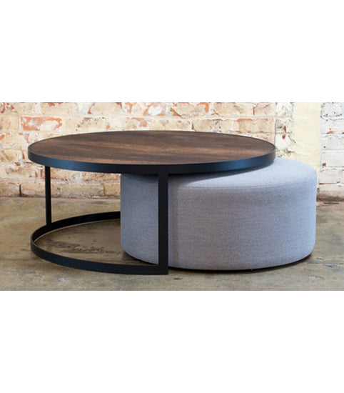 Round coffee table with inserted planked Oak top and steel base with gap to accommodate round ottoman or second table.