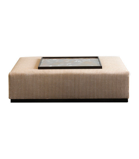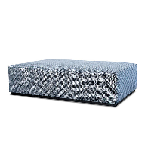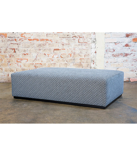 Upholstered ottoman with wooden plinth base. Fabric wraps over with capped ends.