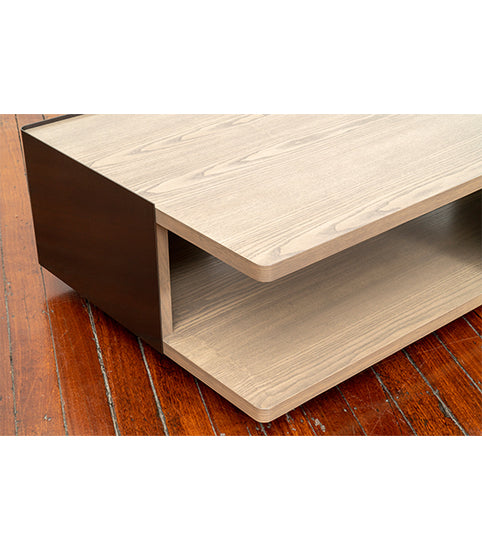 American Ash veneer coffee table with brass corners. Dark aged brass corner overlays. American Ash plinth base.