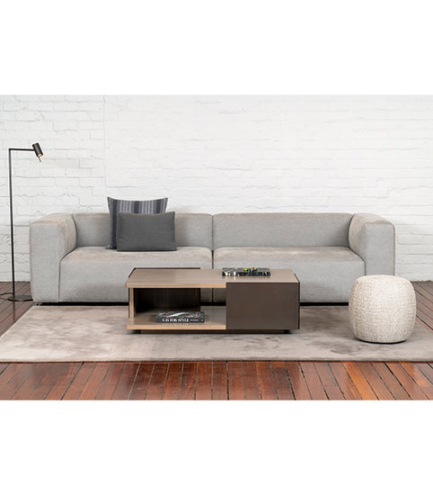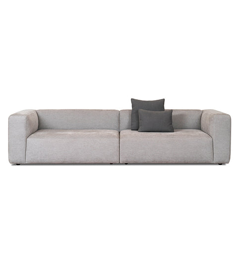 Contemporary modular sofa comprised of two modules joined. Feather duvet back cushioning. Tri-Lux foam seating. Sits on recessed glides.