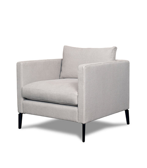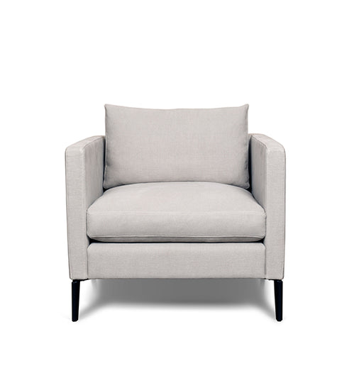 Contemporary armchair. Fine tailored frame. Feather & fibre back cushion. Maxxi feather-wrap seat cushion. Metal legs in matt black.